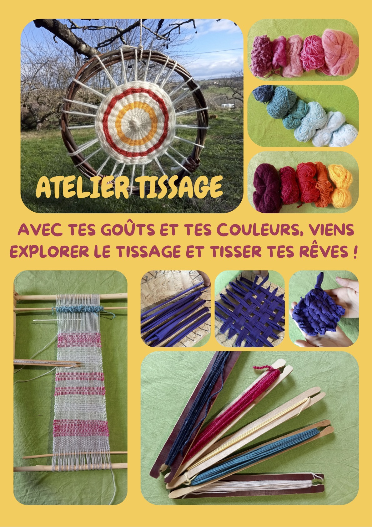 A l'image du « Grand Tisserand », je propose de t'initier au tissage à travers la réalisation de différents objets : cerceau tissé, fabrication d’ éponges Tawashi, bracelet en macramé et perles, panneau mural décoratif, tissage collectif de grande taille...